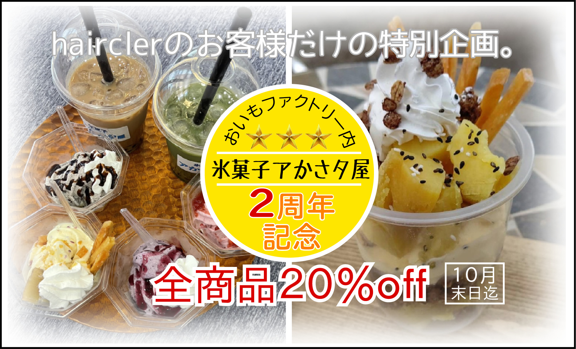 『hairclear顧客様限定‼️』おいもファクトリー内・アかさタ屋②周年記念!全商品20%オフ(10月末日迄)